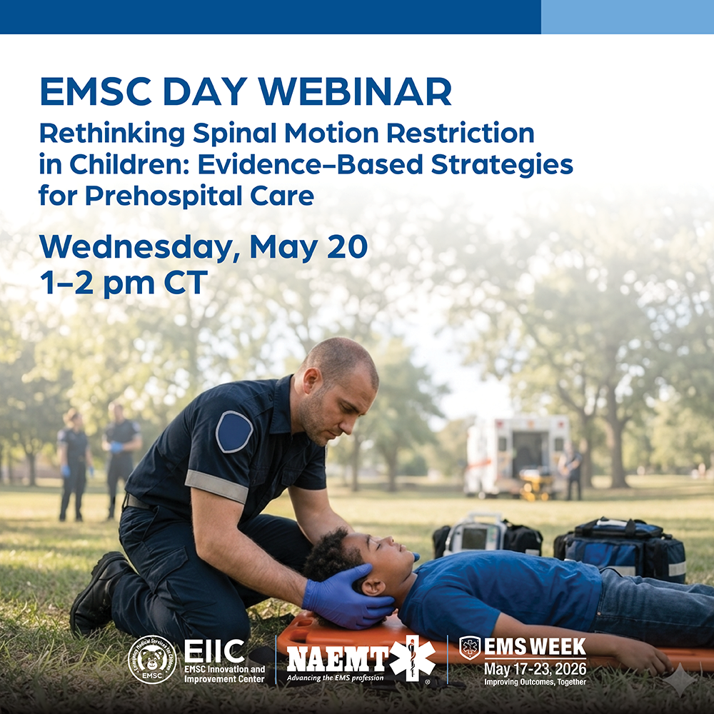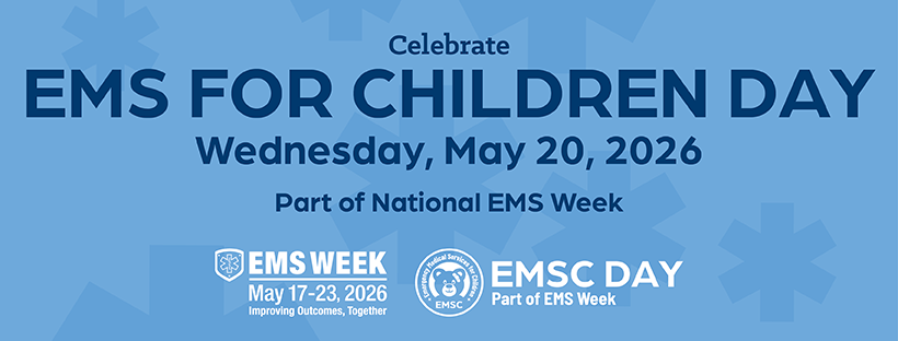 EMS for Children or EMSC Day, part of National EMS Week, will take place this year on Wednesday, May 20. The day is an annual opportunity to thank our EMS clinicians for their dedication to children and to spotlight the work of the federal EMSC Program. Visit EMSC’s website for details about celebration resources and activities, including a webinar about managing cervical spine injuries in children, cohosted with the National Association of EMTs: https://bit.ly/EMSforChildrenDay.