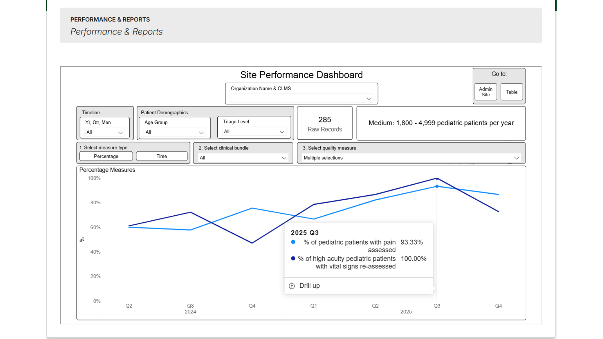 Get a firsthand look at how NPRQI transforms data into actionable insights. Our sample dashboards and reports provide a clear snapshot of key performance metrics, helping EDs track progress, identify trends, and improve pediatric care. Explore real examples of how NPRQI supports data-driven decision-making to enhance emergency care for children.
